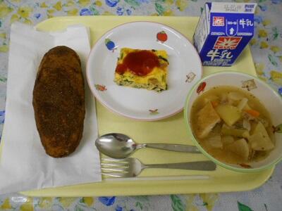 ココア揚げパン、ミートオムレツ、洋風煮込み、牛乳