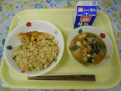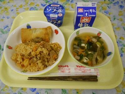 キムチごはん、春巻き、わかめスープ、ヨーグルト、牛乳
