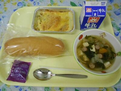 コッペパン、ブルーベリージャム、マカロニグラタン、野菜スープ、牛乳