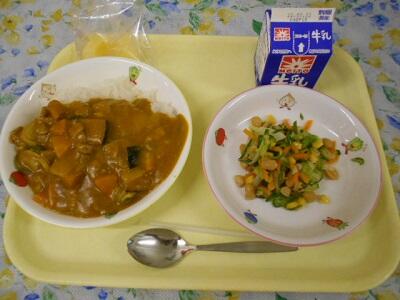 夏野菜カレー、豆サラダ、冷凍りんご、牛乳