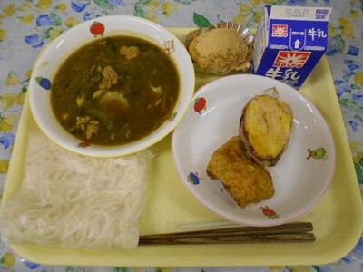 カレー南蛮、天ぷら(イカ、さつまいも)、おはぎ、牛乳