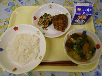 ごはん、メンチカツ、おかか和え、わかめスープ、牛乳