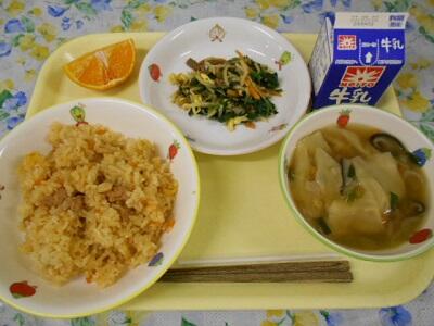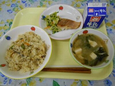たけのこごはん、赤魚の塩焼き、春キャベツの浅漬け、味噌汁、牛乳