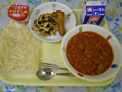 ミートスパゲティ、手羽元のママレード煮、パリパリサラダ、ヨーグルト、牛乳