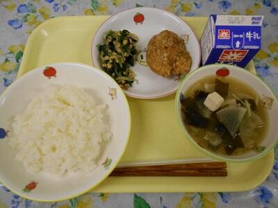 ごはん、鶏肉の唐揚げ、納豆和え、大根の味噌汁、牛乳