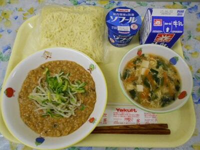 ジャージャー麺、サンラータン、ヨーグルト、牛乳