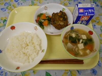 ごはん、手作りさつま揚げ、甘酢和え、豚汁、牛乳