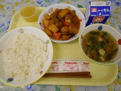 ごはん、酢豚、中華スープ、りんごゼリー、牛乳