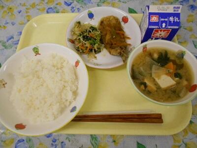 ごはん、イワシのマリネ、ごま和え、味噌汁、牛乳