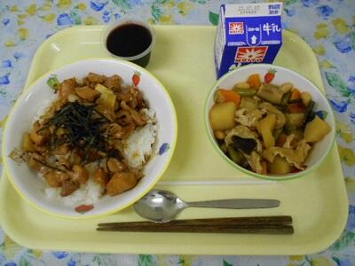 焼き鳥丼、五目煮、ぶどうゼリー、牛乳