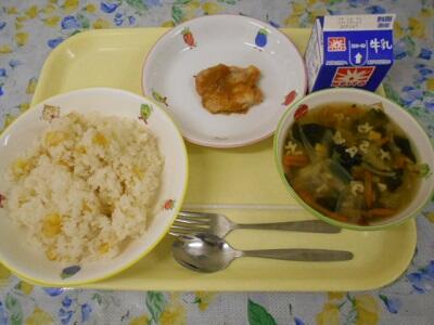 ポテトピラフ、鶏肉の梨ソースがけ(市川市産梨)、ABCスープ、牛乳