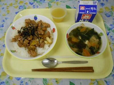 焼き鳥丼、味噌汁、りんごゼリー、牛乳