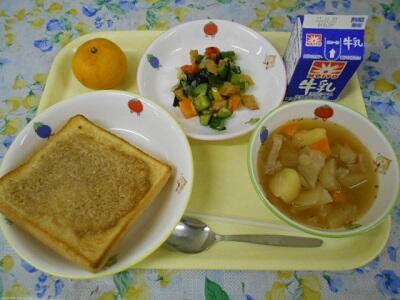 セサミトースト、竹輪のコロコロサラダ、ポトフ、みかん、牛乳
