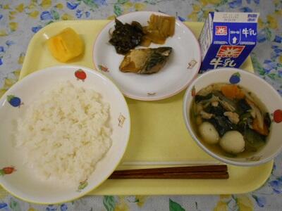 ごはん、サバの味噌煮、だまこ汁、柿、牛乳