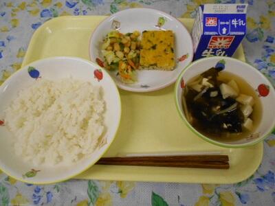 ごはん、千草焼き、豆サラダ、沢煮椀、牛乳