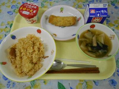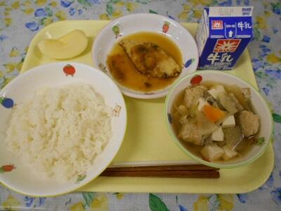 ごはん、サバの揚げおろし煮、鶏の団子汁、りんご、牛乳