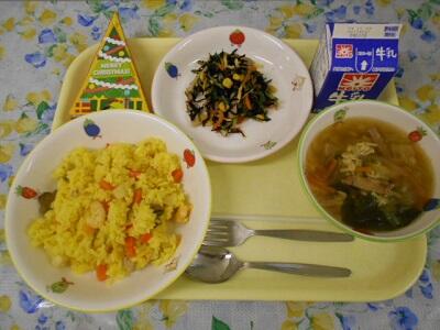 パエリヤ、パリパリひじきサラダ、ABCスープ、クリスマスケーキ、牛乳