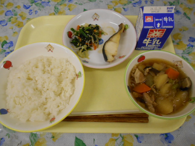 ごはん、タラの西京焼き、ゴマ和え、肉じゃが、牛乳