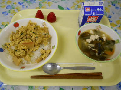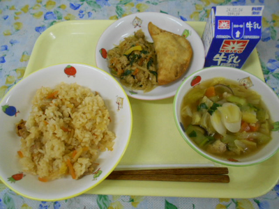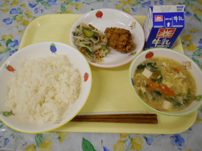 ごはん、鶏のから揚げ、ごぼうとハスの和風和え、かき玉汁、牛乳