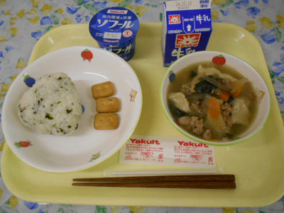 わかめおにぎり、すいとん、乾パン、ヨーグルト、牛乳