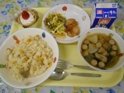 ピラフ、ローストチキン、イタリアンマカロニサラダ、ウインナースープ、いちごタルト、牛乳