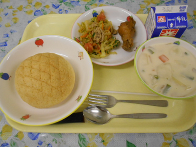 メロンパン、ミルメークコーヒー、手羽元のママレード煮、焼肉サラダ、米粉のクリームシチュー、牛乳