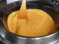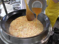 たまごは、割卵したら液卵をざるでこし、なめらかにします。そして、ゆっくりと釜に入れます。