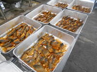 ↓さばの味噌煮を作り終わり、各クラスの食缶に入っている様子です。煮崩れせずに、見た目もおいしそうに仕上がりました