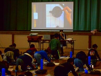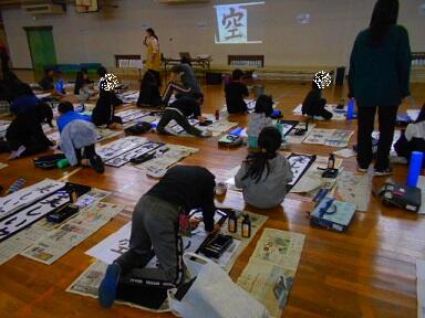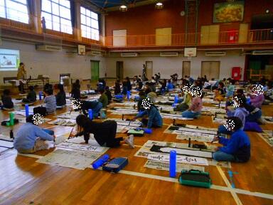 12月14日(木)に5年生は書初め教室を行いました。今回も昴高校の書道の先生にお世話になりました。また、昴高校の期末テストが終わったとのことで、書道部の生徒さんも4人応援に駆けつけてくださいました。児童の間を回ってたくさんアドバイスをしていただきました。5年生は「世界の国」を練習しました。