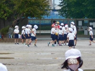 結果的には、9時頃からぽつぽつと雨粒が感じられ始め、全学年の団体演技、競技が終了したところで、延期としました。