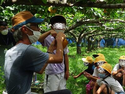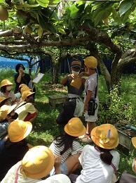 7月11日(月)には、3回目の梨園見学に出かけ、袋かけの様子を観察したり実際に代表の児童が体験させていただきました。