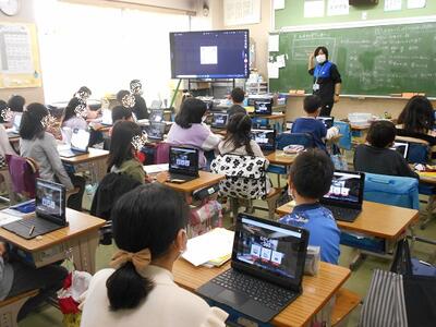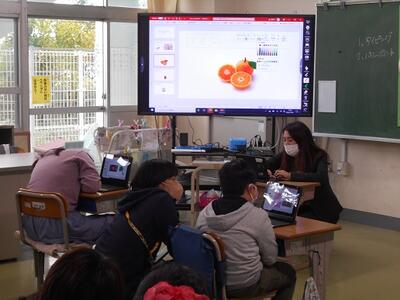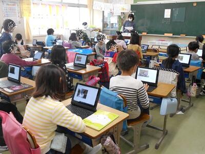 ICT支援員の先生にお手伝いいただきながら、タブレットを使う練習をしています。