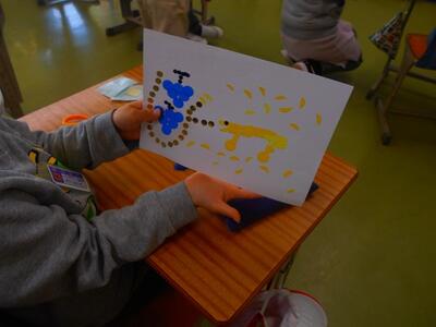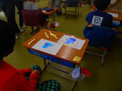 図工の学習。シールを組み合わせてくだものや動物を表現しました。
