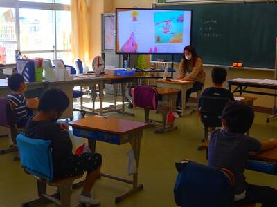 外国語ではタブレットを使いながら、カレーの材料を集めるという課題で、英語でやり取りをしました。