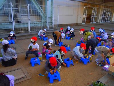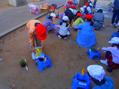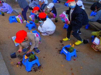 生活科ではアサガオを育てた植木鉢に、新しく球根とパンジーを植えました。