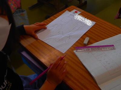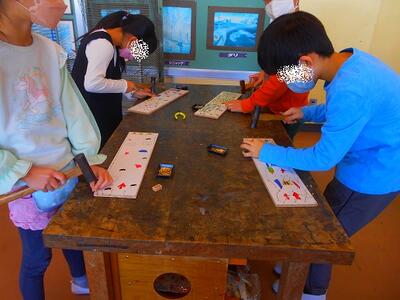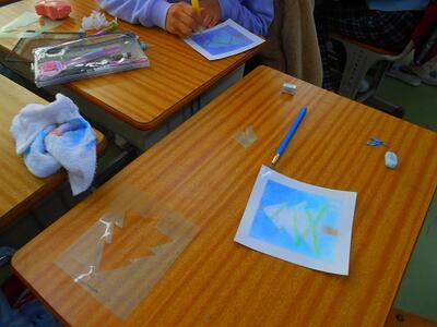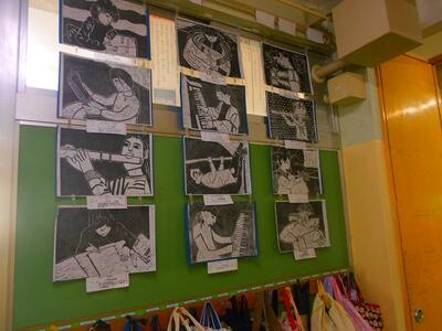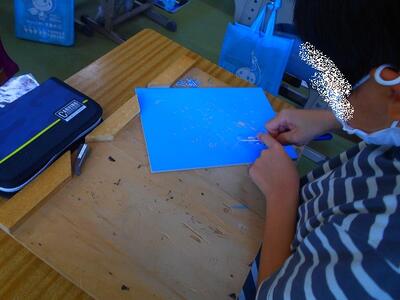 図工では版画に挑戦しました。初めて彫刻刀で板を彫る練習もしました。