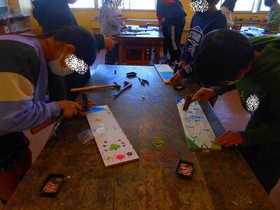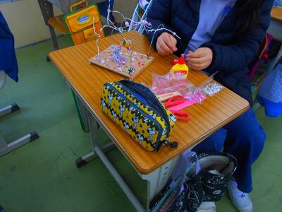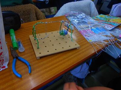 図工の学習。針金を曲げたりまいたりしてイメージを膨らませ、思い思いの作品に仕上げました。