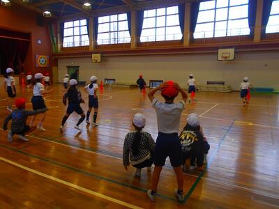 体育の時間は、市川市の体育教科指導員の先生のご指導で、体つくりの運動をしました。
