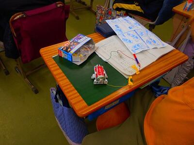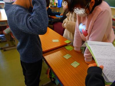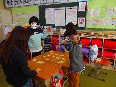 外国語活動では、理想の学校になるように教室配置などを英語のカードを使って考えました。