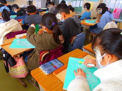 図工の時間には、彫刻刀を初めて使って版画に挑戦しています。