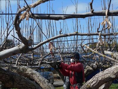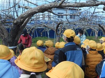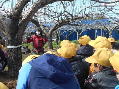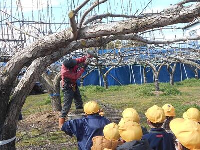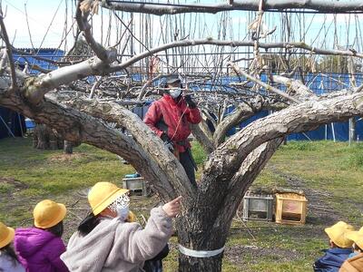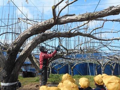 本日、3校時に3年生は、学校のお向かいにある石井梨園さんにお邪魔して、今年度最後の梨園見学の授業を受けてきました。本日は、来期に向けて良い実を実らせるために、余分な枝を切り落とす「剪定」という作業を見せていただきました。切り口にはばい菌等が入らないように薬を塗ることも教えていただきました。また、児童も枝を切る体験をさせていただき、市川市の特産品でもある「なし」についてより深く学ぶことができました。