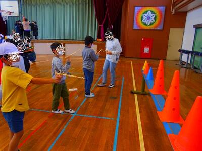 ゴム鉄砲の様子。用意してあった的が見当たらず、急遽コーンを的にして行いました。臨機応変に対応できて素晴らしいですね。