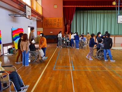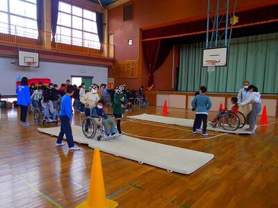 ブラインドマスクチームと車いすチームが交替し、一通りどちらも体験しました。どちらも、ただ手を引けばよいものではなく、また、力いっぱい押せばいいものではないことを身をもって体験しました。一番大切なことは「相手の気持ちになって」お手伝いをすること。ではないでしょうか。