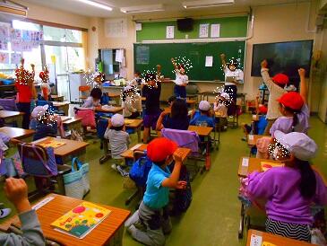 初めての昼学習の時間は、運動会の応援係のお兄さんお姉さんが、応援の仕方を教室まで教えに来てくれました。