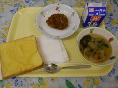 おさつトースト、コロッケ、野菜スープ、牛乳