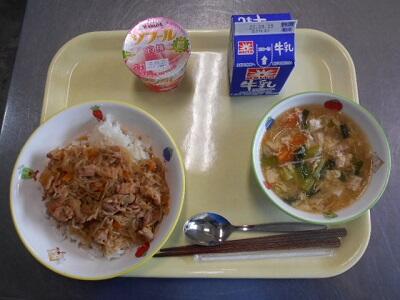 豚丼、にら玉汁、ヨーグルト、牛乳