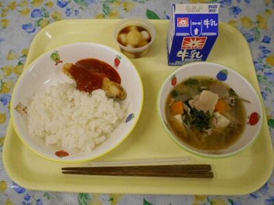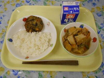 ごはん、手作りさつま揚げ、生揚げの肉味噌煮、牛乳