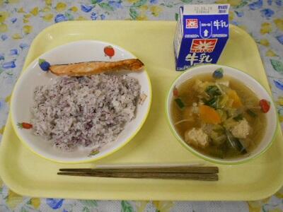 ゆかりごはん、サケの塩焼き、ちゃんこ汁、牛乳
