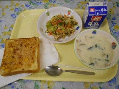 ツナコーントースト、焼肉サラダ、米粉のクリームシチュー、牛乳