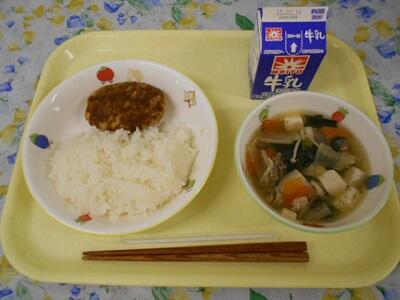 ごはん、メンチカツ、のっぺい汁、牛乳